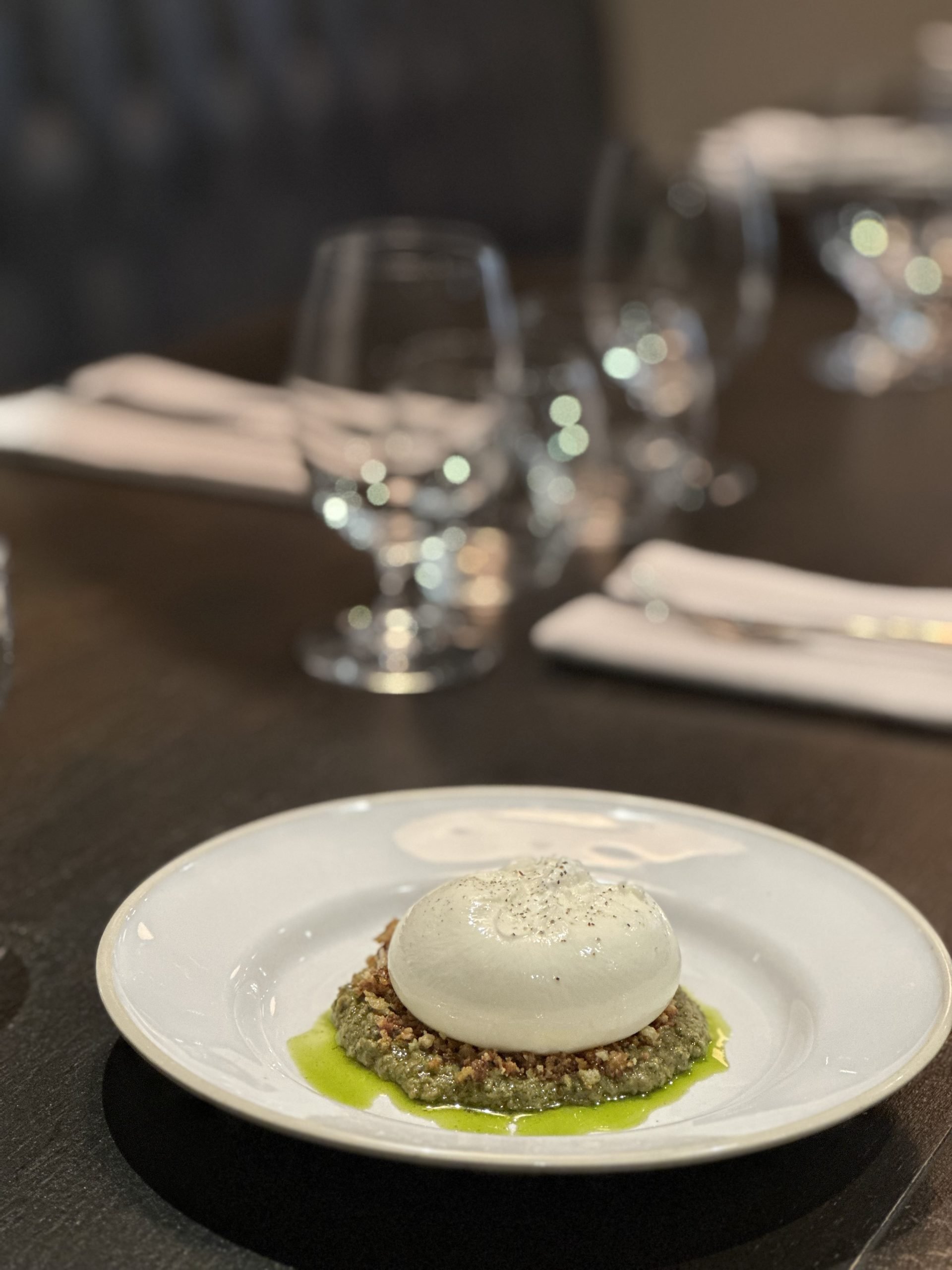 | Whole Burrata, Roquette & Walnut Pesto, Pangritata A luscious whole burrata accompanied by a vibrant combination of roquette and walnut pesto. The pangritata provides a delightful crunch, enhancing the overall texture and flavour profile of the dish. |