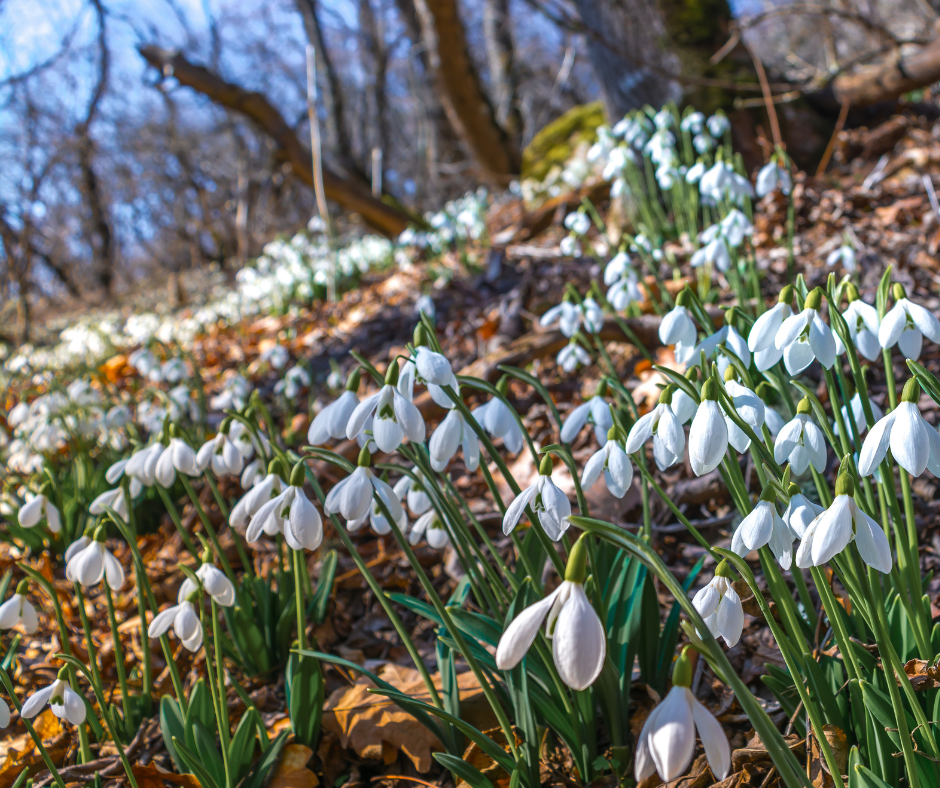 Shimmering through the earth are the beautiful sights of pure white snowdrops, which mass together in a snowy frenzy of activity. Too dainty to compete with summer flowers and leafy canopies, they have made their peace often with snow and ice, antifreeze coursing through their veins, in order to claim a quota of the faint winter sun.