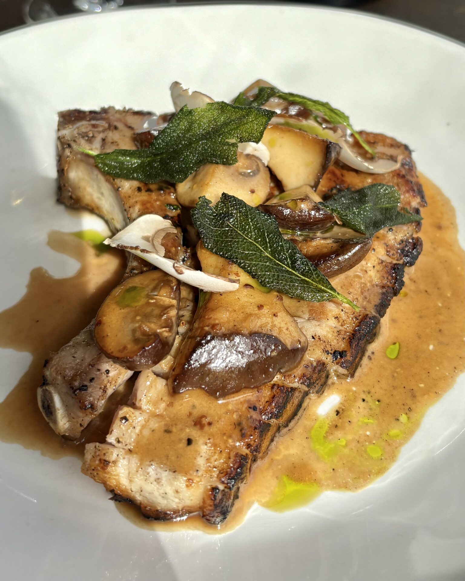 Pork chop with wild mushrooms and Scotch sauce – hearty and generous.